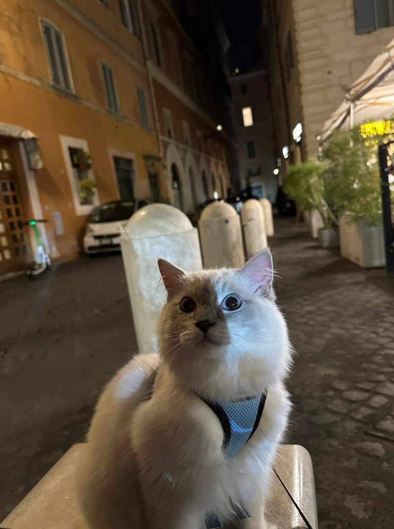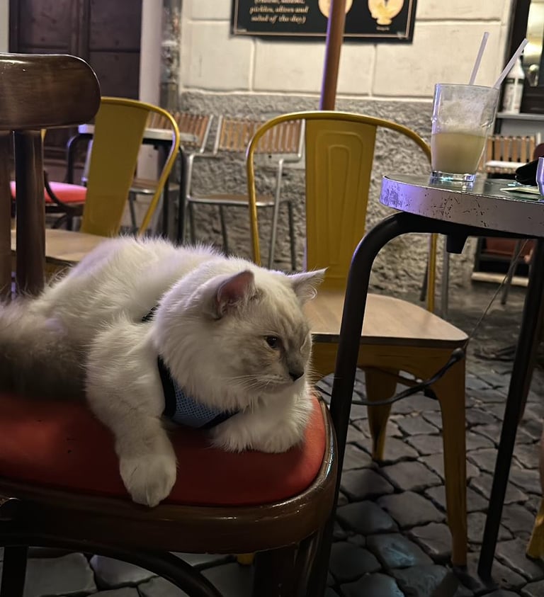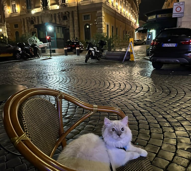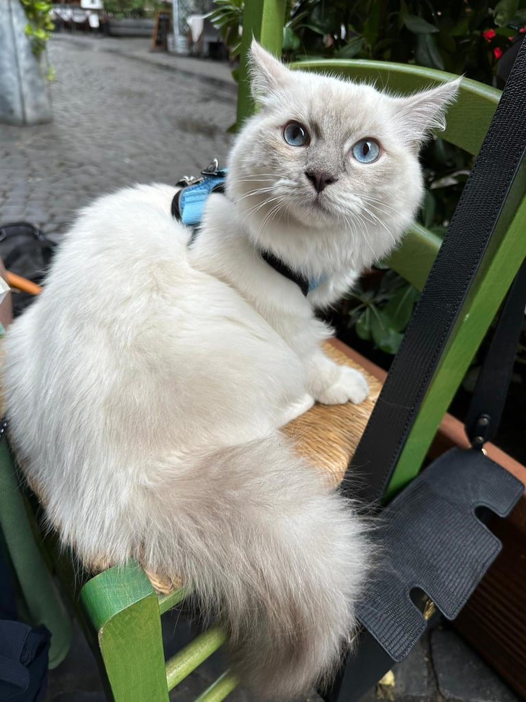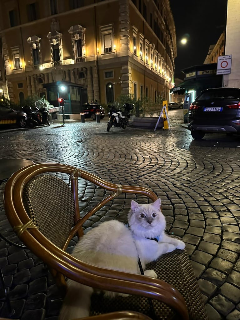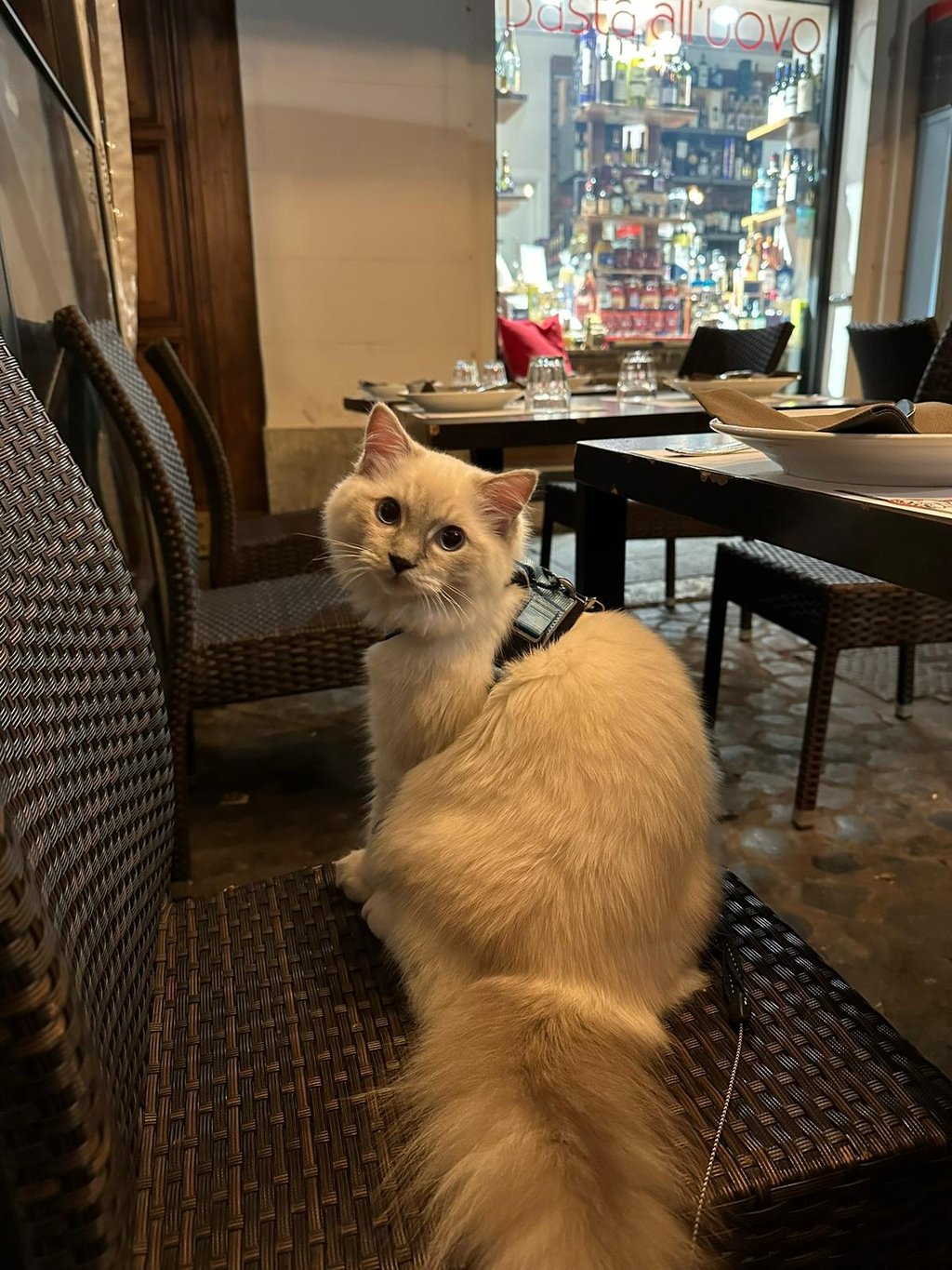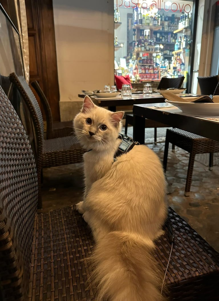 Je suis resté bien sage, profitant du soleil italien et des regards émerveillés des passants. Ils semblaient tous surpris de voir un chat aussi élégant et tranquille dans un bar en extérieur. Mais bon, c’est normal, je suis un Ragdoll après tout, on a la classe, non ? 😼