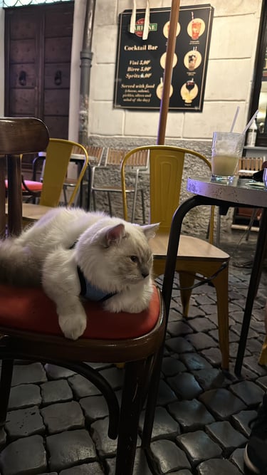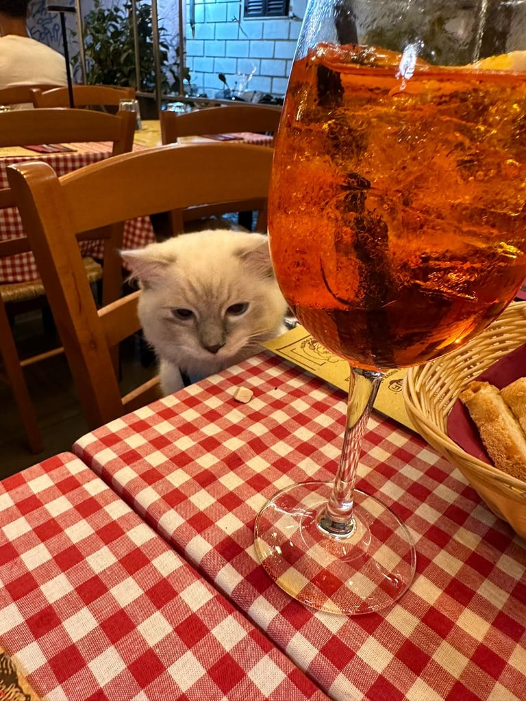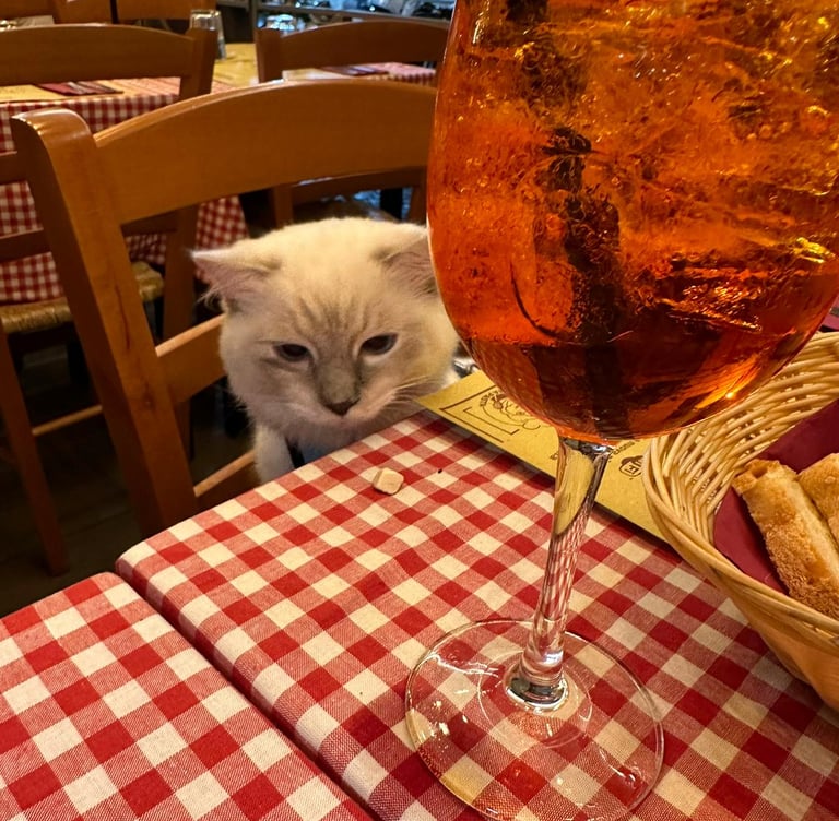 Tous les jours, nous partions découvrir la ville. J’ai même eu droit à une balade en terrasse ! On m’a mis confortablement sur une chaise pendant que mes maîtres sirotaient un spritz. J’ai bien regardé, mais après avoir reniflé, j’ai décidé que ce n'était pas vraiment mon truc. Moi, je préfère l’eau bien fraîche ! 😸