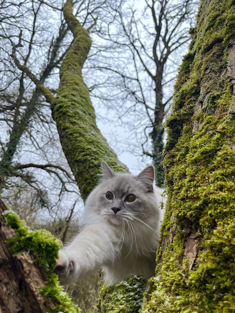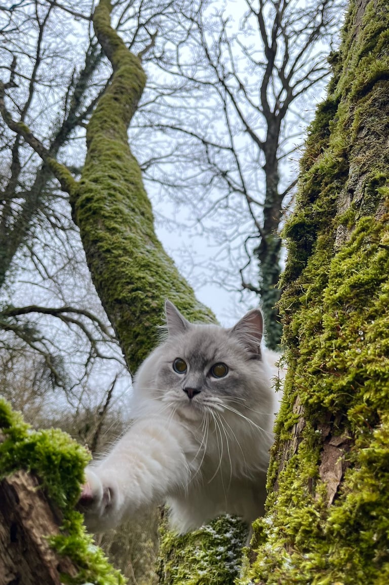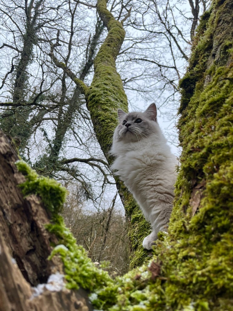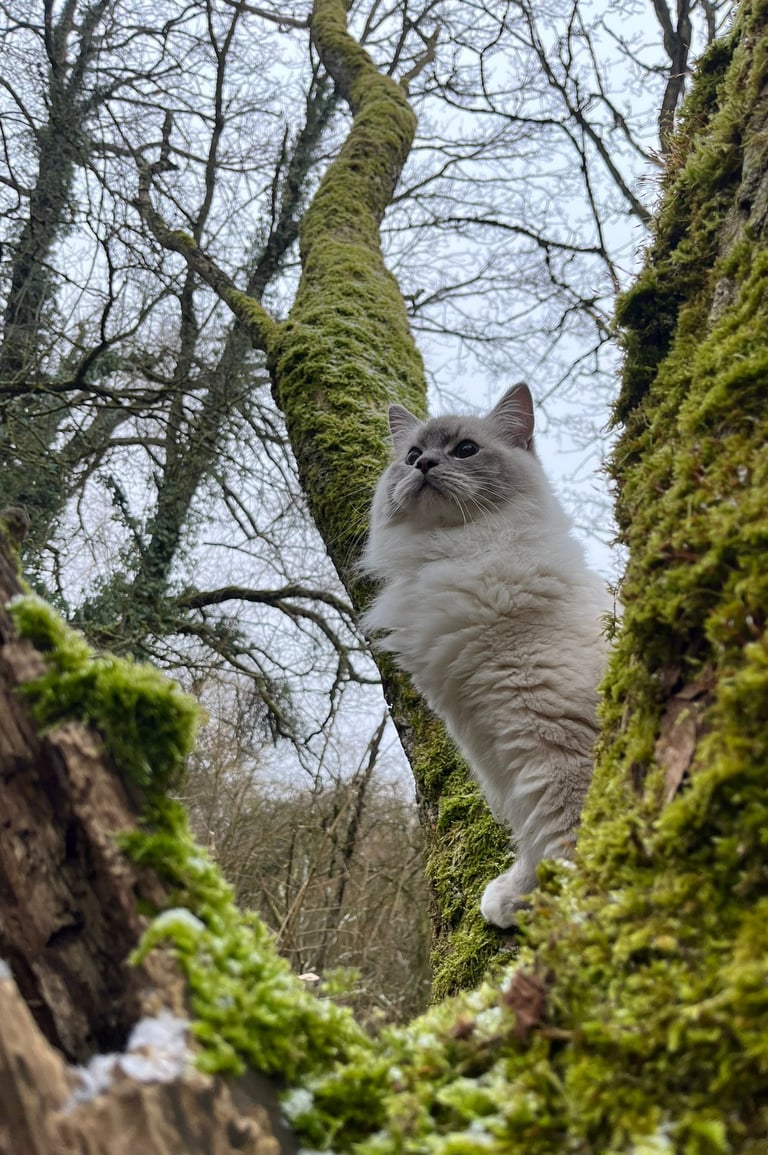 Alors que nous arpentions un sentier bordé de fougères, un arbre majestueux a attiré mon attention. J'ai bondi — enfin, presque. Le harnais me rappela doucement que je ne pouvais pas tout à fait suivre mes impulsions. Mais ma maitresse, toujours attentive, m'a aidé. Avec sa main douce qui guidait légèrement la laisse, elle m'a permis de grimper à mi-hauteur de cet arbre. De là, j'avais une vue imprenable sur la forêt. Mon cœur battait d'excitation et de fierté. Quelle sensation exquise d'être si proche des cimes!